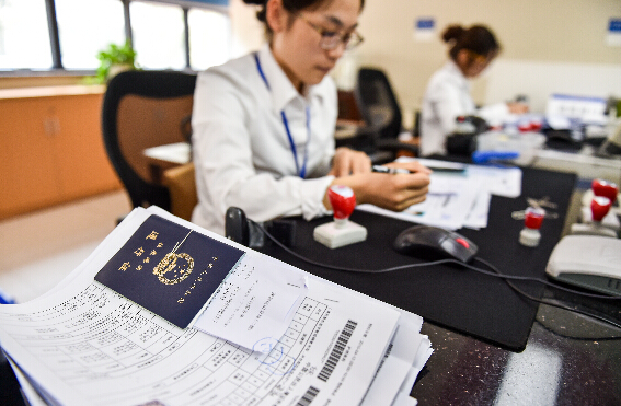 4月13日,深圳福田公安分局行政服务中心的工作人员在受理港澳通行签注业务。