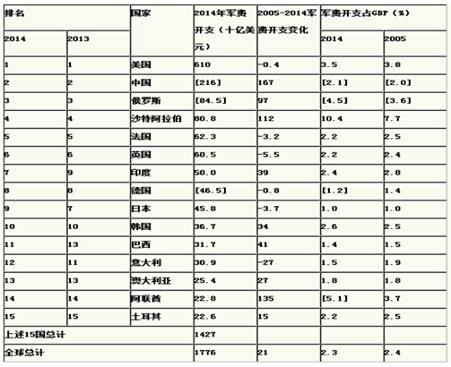 2014年全球軍費開支前15名國家,數據為斯德哥爾摩國際和平研究所自行估算。