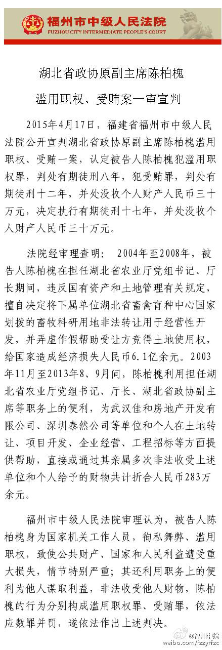 福州中院4月17日消息,湖北省政协原副主席陈柏槐滥用职权、受贿获刑17年。陈柏槐被控受贿283万,致国家造成经济损失5.4亿多元。