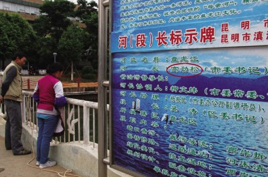 4月12日上午,位于昆明市中心、横跨盘龙江的得胜桥上,多块由昆明市滇池管理部门安装的盘龙江“河(段)长标示牌”显示,“河长”是高劲松,标注为“市委书记”。(编者注:2008年3月,在时任市委书记仇和主导下,昆明确立了滇池流域主要入湖河道实行综合环境控制目标“河(段)长负责制”,仇和自任盘龙江河长,此后张田欣、高劲松也相继接任“河长”。)