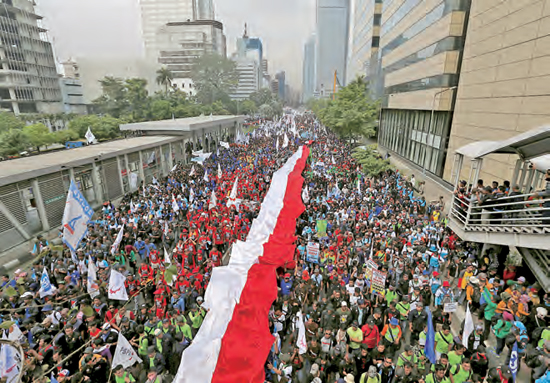 由昨日上午10時許開始,上萬的印尼工人身著統一服裝,聚集在雅加達市區譚林大道的環形噴泉池四周,他們高舉各色旗幟,高呼提高待遇等訴求的口號,并向總統府方向游行。通往總統府的蘇迪曼大道和譚林大道擠滿游行人群,交通臨時關閉。印尼全國工會聯合會主席安迪表示,參加協調游行的勞工組織包括全國工會聯合會、印尼福利工會聯盟、印尼工人聯合會、印尼工會聯盟代表大會和印尼港口運輸工會聯合會,單單在雅加達的示威游行工人就多達約75000人。