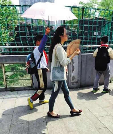 近日,網友爆料,一名女子讓男孩為她打傘。照片中女子手里拿著扇子,男孩撐傘跟隨其后。