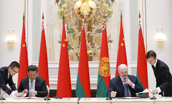 习近平与统卢卡申科共同签署中国与白俄罗斯加强双边合作的文件。中新社