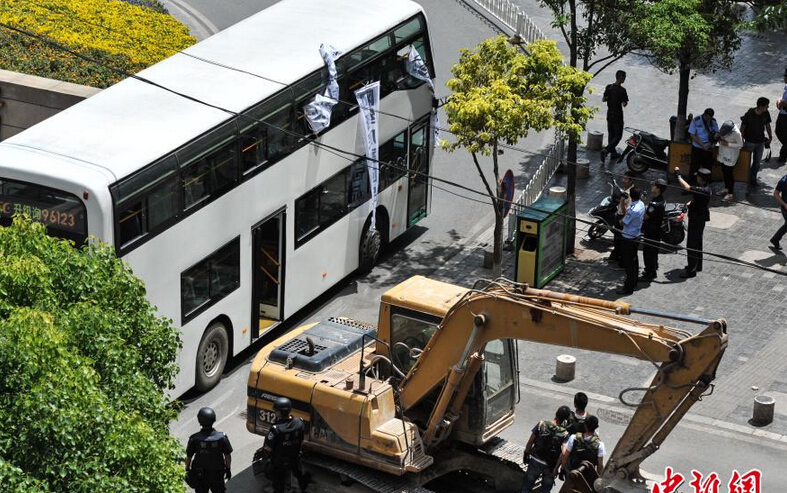5月14日上午11时许,一辆82路双层公交车行驶至昆明市南屏街终点站时,二层的车厢内突然发生人质劫持事件。