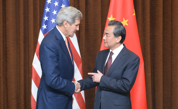 16日王毅在外交部會見了到訪的美國國務卿克里,雙方就習近平總書記9月應邀訪美事宜和即將舉行的中美戰略與經濟對話進行了磋商。王毅對克里說:“相信你這次是為合作而來,不是為吵架而來。”稍后,王毅將與克里一道共見記者。(記者王旭)