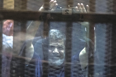 主審法官宣讀死刑判決時,穆爾西身著藍色囚服,坐在一個鐵籠中,對法官揮舞拳頭以示抗議。