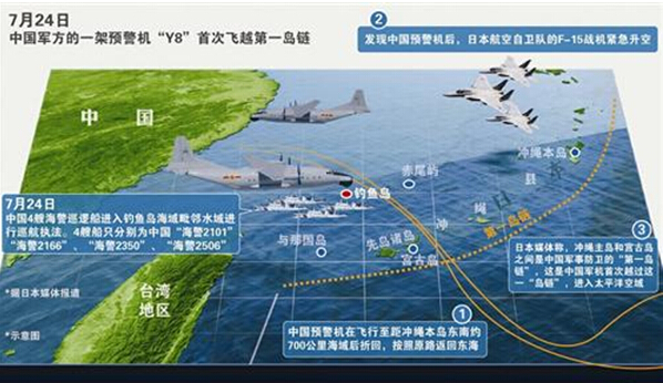 2013年7月26日,日本媒体称,冲绳主岛和宫古岛之间是中国军事防卫的“第一岛链”,这是中国军机首次越过这一“岛链”,进入太平洋空域。报道称,中国这架预警机飞越的时间是从前日上午到下午,在飞行至距冲绳本岛东南约700公里海域后折回,按照原路返回东海。