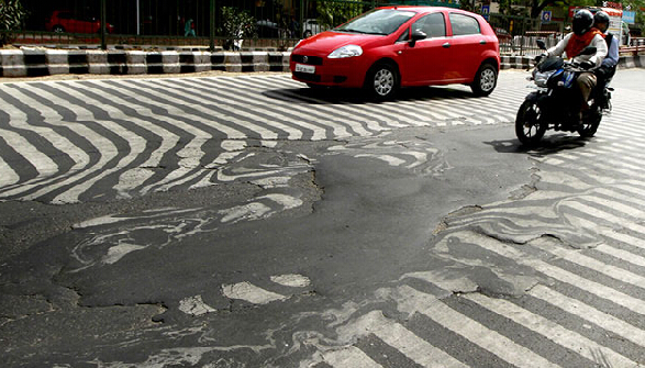 《印度斯坦时报》26日的封面图片显示,首都新德里的一条道路融化,斑马线变得扭曲模糊。(Sanjeev Verma/ HT photo)