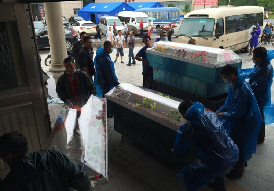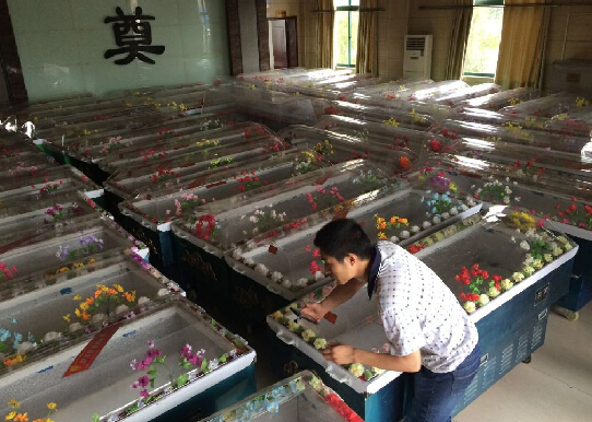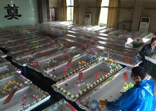 湖北监利殡仪馆工作人员正准备大量冰棺