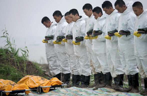 救援人员向遇难者遗体默哀。