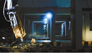 南頭關位于寶安區與南山區交界,整個二線關進關方向共有7個檢查崗亭。當晚7時許,施工方深圳市路橋集團派出30余名工作人員進行現場作業,拆除工作設備包括一臺炮機、兩輛挖掘機等工具。當晚8時許,施工人員在距離關口一百米處放置雪糕筒,將當晚施工的進關方向最右側兩條車行通道封閉。晚9時至10時20分,一臺炮機將兩處寬約4米、高40厘米的車檢通道查驗設施安全島鏟平,但檢查崗亭及雨棚并未于當晚拆除。與此同時,崗亭內部分不涉及管線的物品已于當晚清出。