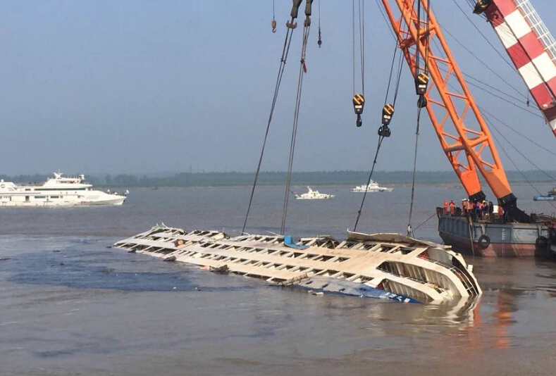 6月5日,沉船救援扶正作業開始,沉船完全扶正露出頂棚,設施嚴重變形。小船靠近被扶正的東方之星號,對船艙內的物品進行清理和打撈。
