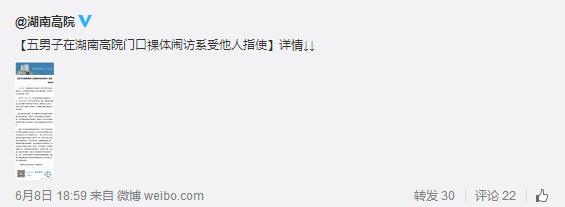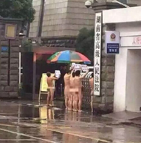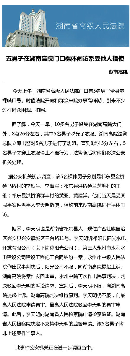 6月8日,一張5名男子赤身裸體并排站在湖南省高級人民法院門口的照片在網絡上流傳。湖南高院隨后在官方微博回應稱,5名男子是受某民事案件當事人李天明指使,李曾因不服判決多次上訴,但均遭駁回。