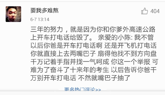 @要我多難熬:三年的努力,就是因為你和你爹在高速公路上開車打電話給毀了。 親愛的小陳:我不管以后你爸是開車打電話啊 還是開飛機打電話 你就直接上去兩嘴巴子 扇得他找不到方向盤 千萬記著手指并攏一氣呵成 你這一個舉報 可難為了奮斗了十來年的考生 以后告訴你爸千萬別開車打電話 不然就嘴巴子抽了。