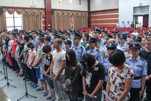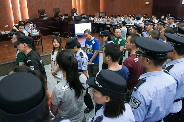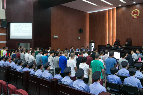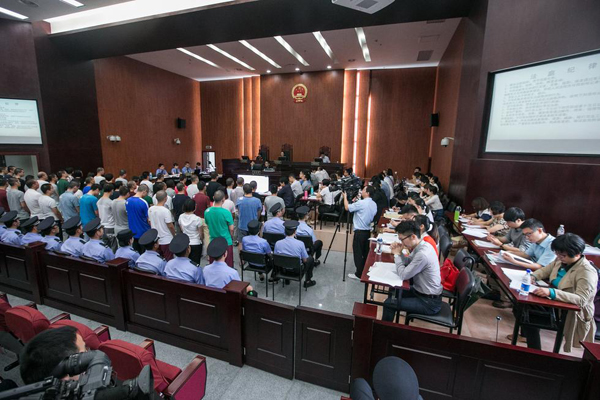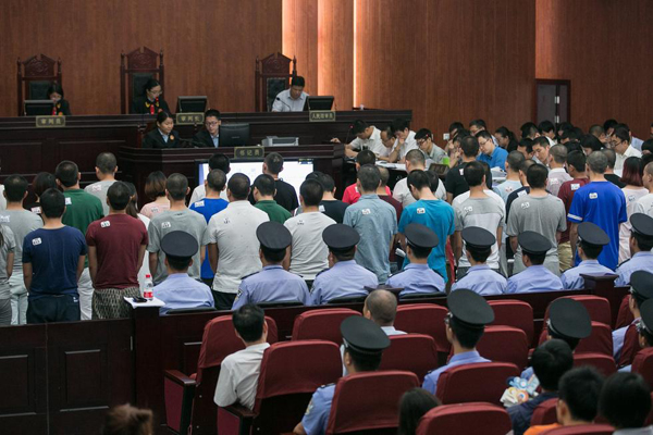 6月10日,杭州市余杭區法院開庭審理了“1040陽光工程”特大傳銷案,蔡某等53名被告人出庭受審。庭審現場,因為辯護律師也達50多名,法院特地搭建了木板臺子,增加了十多張折疊桌,供辯護律師就坐。庭審開始后,53名被告人在法警的押送下,排隊走進法庭,站滿了整個審判區,足足三排。包括60多名法警在內,光在審判區內參加庭審的人數就超過150人。(圖片/CFP)