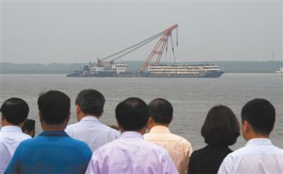 昨日清晨,記者在現場看到,原本并排停在“東方之星”左側的2艘起吊船有1艘駛到了另一側;9時許,現場開始為拖行做最后的準備,事發水域暫時禁航;10時許,1艘浮吊船、2艘拖輪與“東方之星”客船組成的編隊緩緩向上游駛去。
