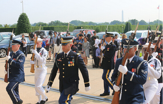 美軍儀仗隊在美國國防部準備列隊歡迎到訪的中央軍委副主席范長龍。張旭攝