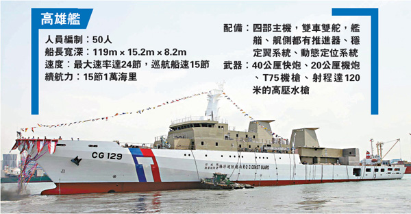 高雄艦最高排水量3719噸,是臺灣海巡署編制內的最大型艦艇,人員滿編50人,船長119公尺、船寬15.2公尺、船深8.2公尺;最大速率達24節,巡航船速15節,續航力1萬里;武裝包括20公厘機炮、40公厘快炮、T75機槍等,還有驅離專用的高壓水槍,射程可達120公尺以上。(據東森新聞)