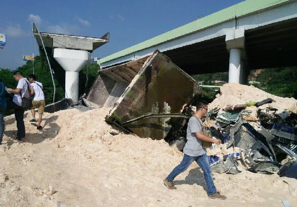 6月19日*晨3时许,粤赣高速广州往河源方向城南出口匝道突然断裂坍塌,在匝道行驶的4辆货车坠落,当前事故已造成1死4伤,当地仍在进行紧张救援,具体伤亡数字仍在统计。