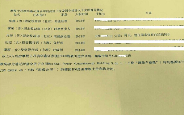 2014年9月2日下午,一份名为“摩根士丹利华鑫证券录用的高官子女及国企领导人子女情况”的文件在网上流传。该文件曝光了摩根士丹利华鑫证券5名员工的名字,并列出了他们身为政府高官或国企高管的父母担任的职务。该材料在中国社交媒体上引发热议。