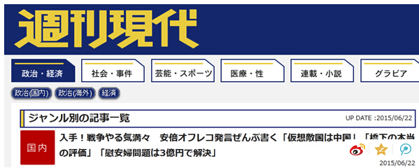 最新一期的日本杂志《周刊现代》爆料称,6月初,日本首相安倍和各媒体负责人在东京一家高级中餐馆“赤坂饭店”召开“恳亲会”。“恳亲会”就是安倍与媒体管理人员的一种联系会,要求媒体对其进行拥护性、支持性的报道。该杂志称,安倍当天在“恳亲会”上喝完自己杯中红酒之后,就开始连发惊人之语。谈及国会辩论、安保法案相关话题时,安倍开启“将自己学说强加给周围人”的模式,大力批判日本在野党的民主党党代表冈田克也,称其“总是说没有意义的废话”“民主党要完蛋了”等等。谈到集体自卫权时,安倍竟然放言称:“安保法案就是冲着南海上的中国。所以说了要做(指通过安保法案),那就一定要做。”安倍在媒体面前,“大大方方”地承认了自己的确在谋划和中国的战争。安倍还称,要行使集体自卫权并和美军一道,“敲打在南海上的中国”。