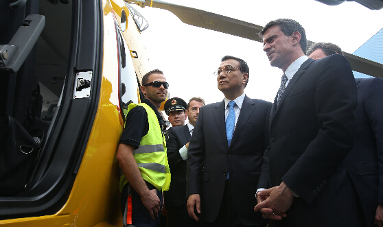 两国总理一同登上中法共同研发、生产的直升机。李克强详细询问该机型技术特点和性能状况。项目负责人作了介绍,强调飞机的一半部件由中国企业生产。两国总理在驾驶舱亲切交流,规划中法航空合作的壮丽远景。
