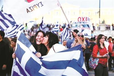 7月5日,希臘雅典,左翼聯盟支持者、反對債權人改革計劃的希臘選民慶祝公投結果 供圖/IC