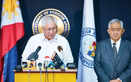 图为2013年1月,菲律宾外长黎罗沙溜在记者会上宣读一份挑战中国拥有南海主权的声明。(法新社)