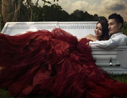 据外媒14日报道,新加坡一对从事殡葬业的夫妇,决定将他们共同的职业带到婚纱照之中——两人用一个棺材作为道具拍照。