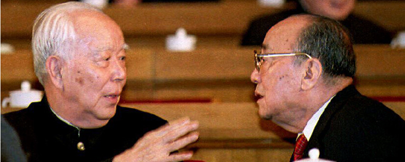 1993年3月15日,即将离任的全国人大委员长万里(左)与时任国家主席杨尚昆在交谈。