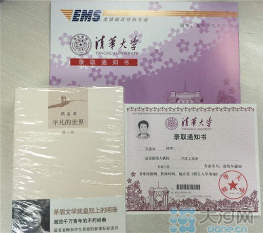 清華大學錄取通知書用紫色信封封裝,信封上有“清華,是你一生的驕傲”一行大字,隨每份通知書一起寄出的還有一套《平凡的世界》。校長邱勇在寄語中寫道:“在祝賀你們即將進入清華開啟新的人生旅程之際,作為校長,我送給你們的第一份禮物是《平凡的世界》這部書。”