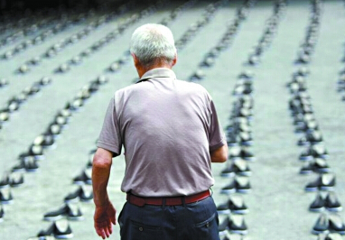 在日本东京塔下的一座公园,87岁的中国被掳劳工幸存者、河北老人李铁锤踉跄地走在象征死难中国劳工的一双双布鞋之间。