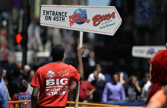美国首次申请失业救济人数降至40多年最低水平7月23日,一名促销员在美国纽约时报广场招揽生意。
