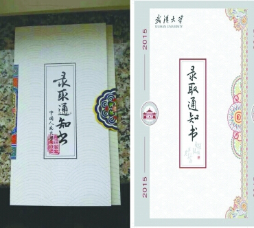 中国人民大学2014年录取通知书(左图)和武汉大学2015年录取通知书(右图)