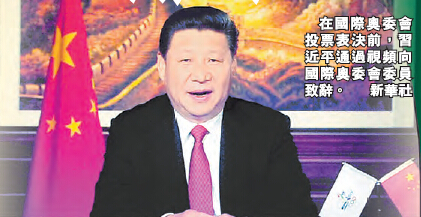 昨日中午,在國際奧委會投票表決前,習近平通過視頻向國際奧委會委員致辭,代表中國政府和人民表達對舉辦2022年冬奧會的期盼之情和最堅定的支持。他表示,2022年冬奧會在中國舉辦將有利於推動中華文明同世界各國文明交流互鑒,帶動中國13億多人關心、熱愛、參與冰雪運動,讓中國人民再次有機會為奧林匹克運動發展和奧林匹克精神傳播作出貢獻,並指中國政府高度讚賞奧林匹克運動的價值觀和國際奧委會的改革主張,將全面兌現每一項承諾,全方位踐行《奧林匹克2020議程》。
