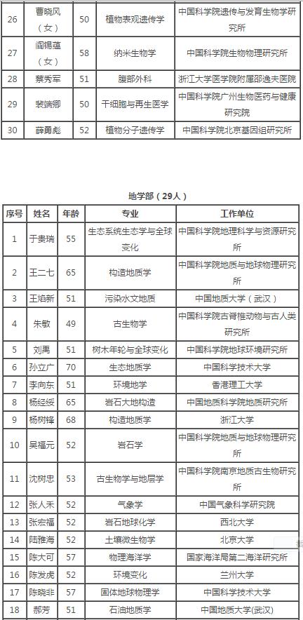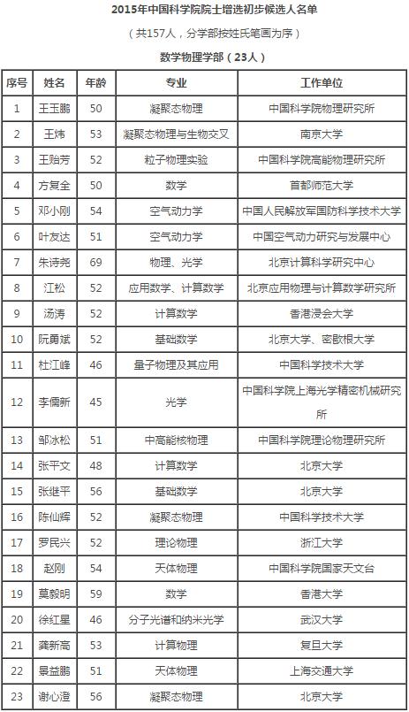 中科院院士增選每兩年進行一次,2015年將最終增選院士不超過65名。此次公布的157名初步候選人中,數學物理學部23人、化學部25人、生命科學和醫學學部30人、地學部29人、信息技術科學部20人、技術科學部30人。其中年齡最大的74歲,年齡最小的43歲。