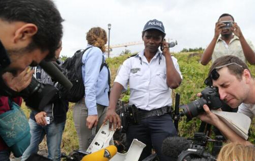 當地時間2015年8月4日,法屬留尼汪島圣但尼,警察在當地發現一塊塑料殘片。