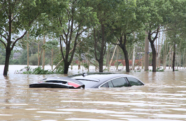 8月9日,浙江温州平阳受“苏迪罗”影响多地成“海景”,众多车辆被淹。