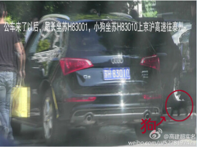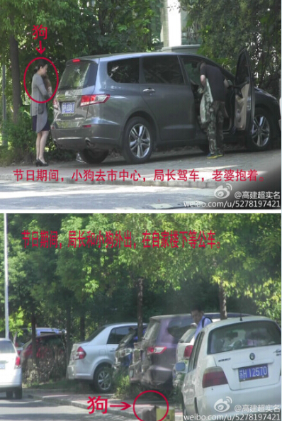 節日期間,老婆抱著小狗去市中心,局長駕車;局長帶小狗外出,在自家樓下等公務車;車來了以后,局長和小狗各坐一輛上京滬高速。微博配圖