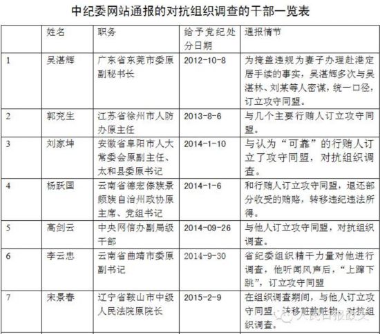 中紀委今年通報21名對抗組織調查干部一覽表