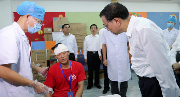 李克強總理16日下午前往天津泰達醫院看望在“8.12”火災爆炸事故中受傷的消防人員、公安干警和普通群眾。他安慰病床上的傷者,希望他們安心養傷,早日康復。在醫院大廳,他勉勵醫護人員進一步發揚人道主義精神,施展高超醫術,最大限度減少死亡和傷殘人數。