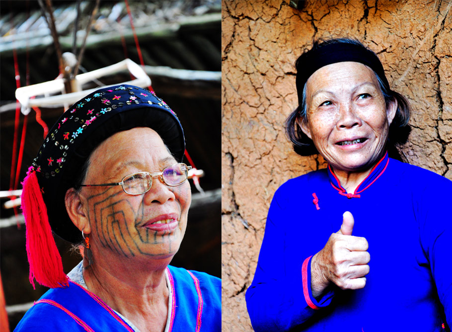右侧的老人,据说是整个村寨中年岁最长、地位最高的纹面阿婆。老人性格开朗,面对镜头大方的哈哈大笑,一把搂过身边的慈祥婆婆,两姐妹摆出各式pose,让大家拍的直呼过瘾。不愧是进过北京,被总理接见过得“大人物”级别,举手投足间,落落大方,自然洒脱。