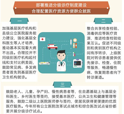 1日國務院常務會議也要求,今年所有公立醫院改革試點城市和綜合醫改試點省都要開展分級診療試點。而早在今年初,國家衛計委新聞發言人毛群安曾透露,今年將制訂分級診療的指導意見,“我要強調的是老百姓要理解,基層醫院和大醫院之間不是同樣功能的機構,他們是功能互補的,我們在考核社區衛生服務機構工作情況的時候就看他能不能解決公眾的一些常見病、多發病,而大醫院是重點解決疑難重癥的。分級診療的目的不是為了限制老百姓看病的自由,而是說幫助老百姓建立一個更科學、更合理的就診的流向。”