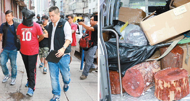 直至本月1日晚上,西九龍總區重案組探員在尖沙咀樂道一帶埋伏及監視,至深夜11時,果然發現4名可疑南亞裔男子進入彌敦道83至97號華源大廈登樓撬開一公司大門,將一批價值約20萬元的紅木搬上一輛客貨車,探員見時機成熟採取行動,當場拘捕該4名男子。打蛇隨棍上,至翌日凌晨時分探員掩至元朗區再拘捕2名南亞裔男子,相信是案中主腦。
