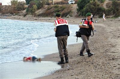 9月2日,博德魯姆,土耳其憲兵站在難民兒童尸體旁。
