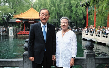 图/CFP昨日,联合国秘书长潘基文与夫人在济南趵突泉留影。趵突泉官博截图