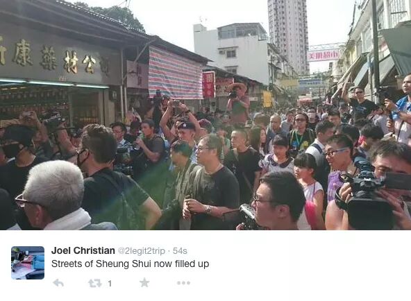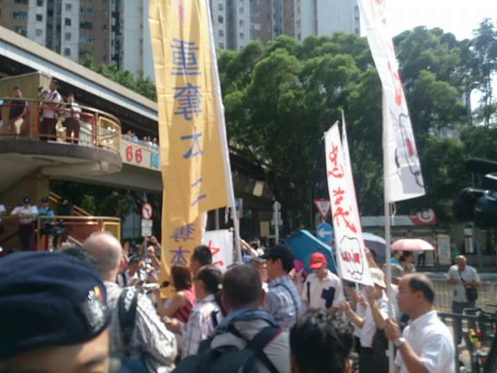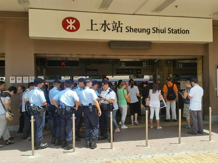 在上水港鐵站近彩園的出口外,有數十名軍裝及便衣警員在場戒備,警方用鐵馬分開兩邊示威者,雙方一度隔著鐵馬互相指罵。