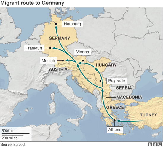 難民前往德國線路。從土耳其到希臘雅典,轉經塞爾維亞從匈牙利和奧地利進入德國。