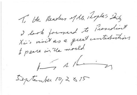 专访结束后,基辛格欣然为人民日报读者题词:“致人民日报读者:我期待着习主席的访问将为世界和平做出重大贡献。亨利.A.基辛格2015年9月10日”。