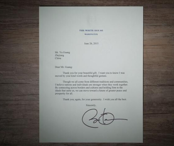 6月5日,俞光将铜像快递给奥巴马,并附上一封信。5天后,查询显示白宫已签收。8月19日,俞光收到了6月26日寄出的奥巴马回信。信中写道:“谢谢你送来如此精美的礼物。毫不掩饰地说,我已被你诚挚的语言和体贴的行为所感动。虽然我们的传统和文化背景不同,但我坚信只有国家和个人共同协作,二者才能变得更强大,这种协作穿越国界和文化,让彼此怀着团结一致的理想,共同步入和平、繁荣的未来。”